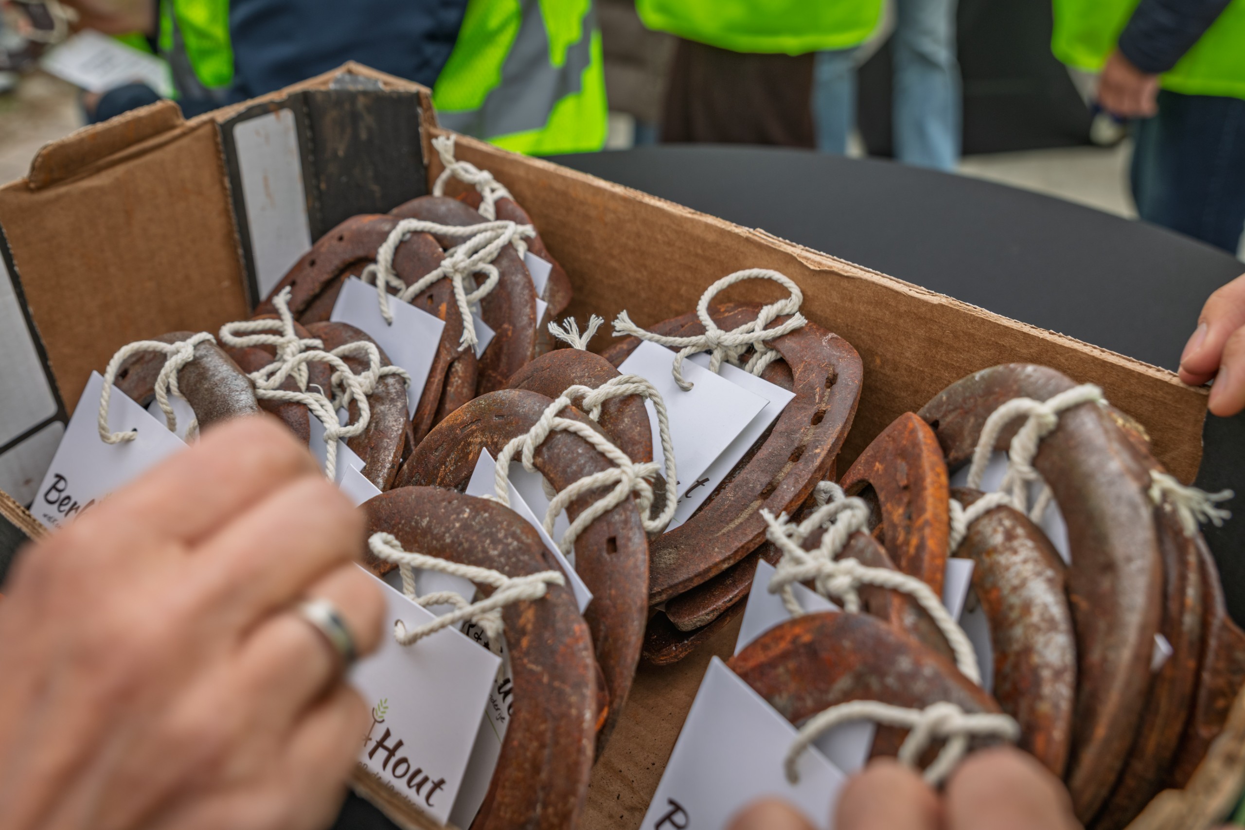 Elke koper ontving een hoefijzer, dat zij symbolisch op de plek van hun toekomstige woning mochten leggen. Zo komt er een beetje extra geluk in de fundering: een ritueel dat past bij de warme, persoonlijke benadering van Berk & Hout.
